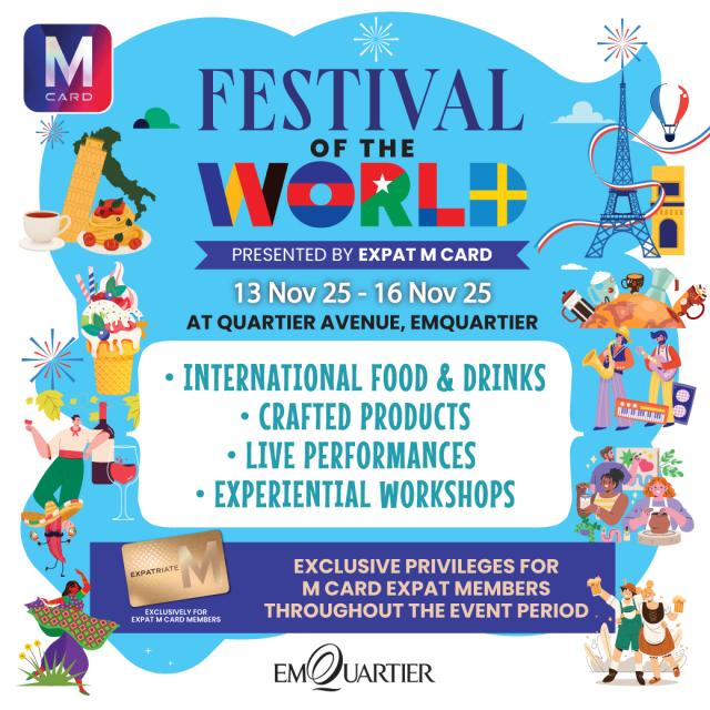 • The Expatriate M Card Festival of the World invites everyone to experience global culture, cuisine, and community — a festival that showcases EmDistrict as Bangkok’s vibrant hub for the international expat community.
