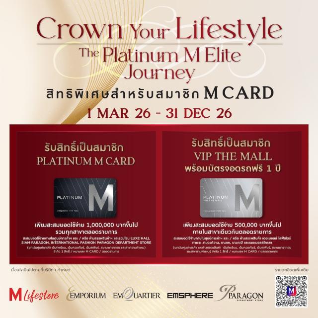 • สิทธิพิเศษสำหรับผู้ถือบัตรสมาชิก M Card เมื่อมียอดใช้จ่ายสะสมยอด 1,000,000 บาทขึ้นไป รวมทุกสาขาตลอดรายการ ภายใต้ชื่อ-สกุล หมายเลขบัตรเดียวกัน ภายในห้างสรรพสินค้าฯ และ / หรือ ศูนย์การค้าฯ สาขาที่ร่วมรายการ และรวมโซน Luxe Hall Siam Paragon, International Fashion Paragon Department Store ระหว่างวันที่ 1 มีนาคม 2569 - 31 ธันวาคม 2569