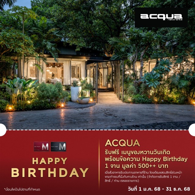 รับฟรี เมนูของหวานพิเศษสำหรับวันเกิด พร้อมข้อความ Happy Birthday 1 จาน มูลค่า 500++ บาท เมื่อสั่งอาหารรับประทานอาหารที่ร้าน โดยต้องแสดงสิทธิ์ล่วงหน้าขณะทำจองที่นั่งกับทางร้าน Acqua เท่านั้น