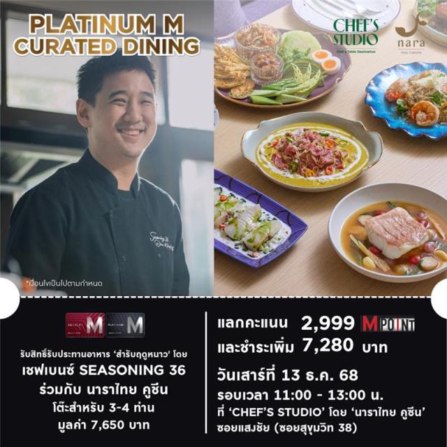 สิทธิพิเศษสำหรับสมาชิก Scarlet M Card และ Platinum M Card แลก 2,999 M Point และชำระเพิ่ม 7,280 บาท รับสิทธิ์รับประทานอาหาร ‘THE WINTER SAM RAB’ สำรับฤดูหนาว CHEF BENZ SEASONING 36 x NARA THAI CUISINE โต๊ะสำหรับ 3-4 ท่าน มูลค่า 7,650 บาท ที่ ‘CHEF’S STUDIO’ โดย ‘นาราไทย คูซีน’ ซอยแสงชัย (ซอยสุขุมวิท 38)