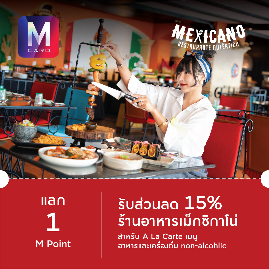 สมาชิก M Card แลก 1 M Point รับส่วนลด 15% สำหรับอาหาร สำหรับเมนู A la carte (ยกเว้นเครื่องดื่มแอลกอฮอล์ )