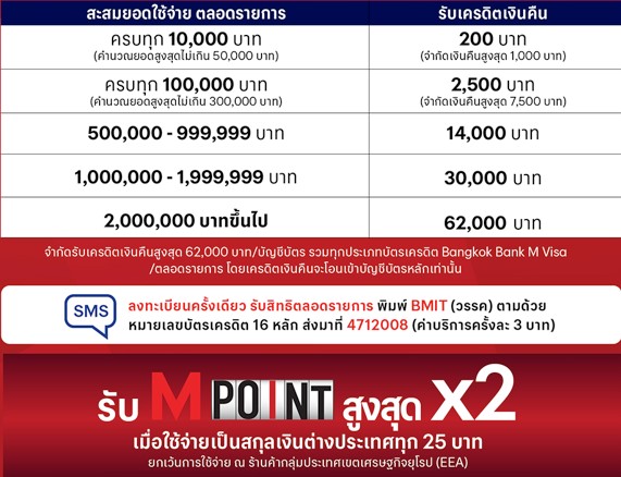 สิทธิพิเศษสำหรับผู้ถือบัตรเครดิต Bangkok Bank M Visa เมื่อใช้จ่ายสะสมเป็นสกุลเงินต่างประเทศ รวมยอดใช้จ่ายออนไลน์ รับเครดิตเงินคืนสูงสุด 62,000 บาท /บัญชีบัตร รวมทุกประเภทบัตรเครดิต Bangkok Bank M Visa ตลอดรายการ โดยเครดิตเงินคืนจะโอนเข้าบัญชีบัตรหลักเท่านั้น