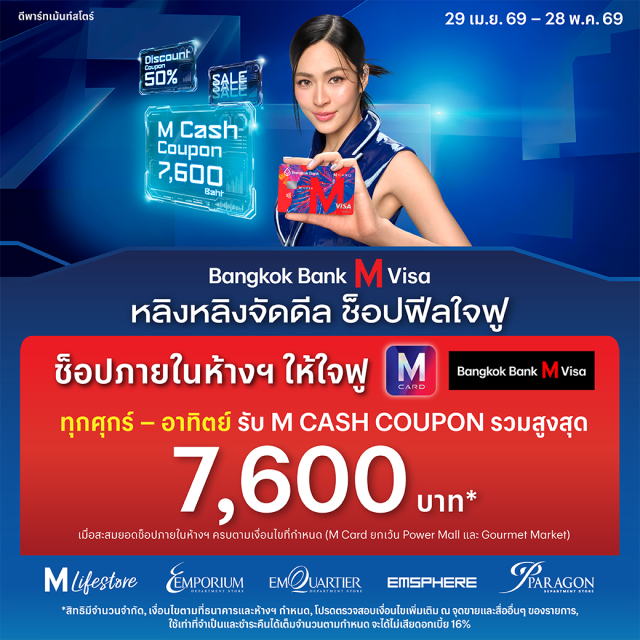 - สิทธิพิเศษสำหรับผู้ถือบัตร Bangkok Bank M Visa ทุกประเภท 100 ท่านแรก ที่มียอดใช้จ่ายสะสมผ่านบัตร เฉพาะชำระเต็มจำนวน รวม 8,000 บาทขึ้นไป / วัน ที่เดอะมอลล์ไลฟ์โตร์บางกะปิ ระหว่างวันที่ 9 พ.ค. 69 – 10 พ.ค. 69 (สะสมยอดใช้จ่ายห้างฯ และศูนย์การค้ารวมกันได้ ไม่เกิน 3 เซลล์สลิป)