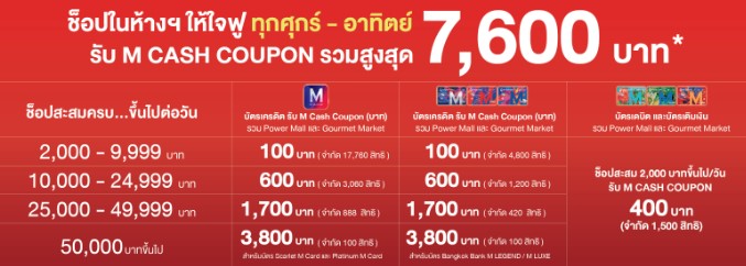 สมาชิก M Card เมื่อสะสมยอดช็อปภายในห้างฯ ครบ 2,000 บาทขึ้นไป/วัน รับเพิ่ม Cash Coupon สำหรับใช้ซื้อสินค้าภายในห้างฯ ที่แผนก Department Store ตั้งแต่ 3,000 บาทขึ้นไป / ใบเสร็จ (ยกเว้น Power Mall และ Gourmet Market)