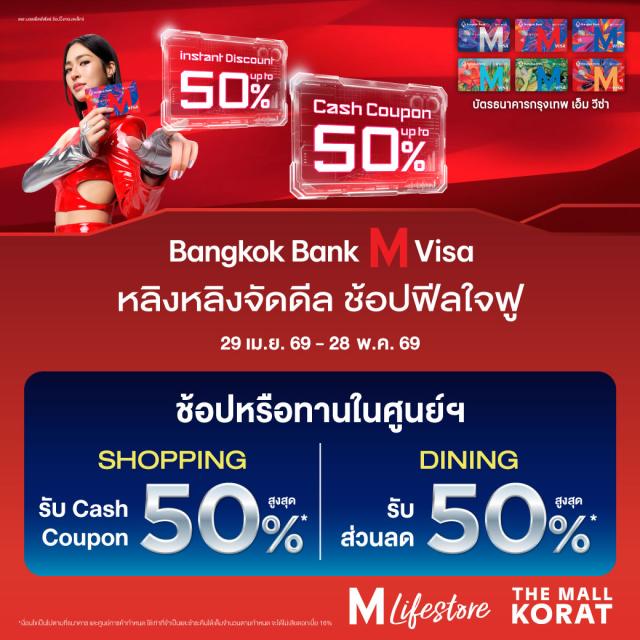 - สิทธิพิเศษสำหรับผู้ถือบัตรเครดิตหรือบัตรเดบิต/บัตรเดบิตดิจิทัล/บัตรเติมเงิน Bangkok Bank M Visa ที่ใช้จ่ายภายในศูนย์การค้า ทั้งร้านอาหาร และร้านค้าเช่า ที่เดอะมอลล์ไลฟ์สโตร์ ทุกสาขา และเดอะมอลล์ โคราช ครบตามเงื่อนไขและนำมาแลกรับ Cash coupon ที่จุดแลกรับของสมนาคุณที่ศูนย์การค้ากำหนด เซลล์สลิปที่ลงทะเบียนแล้วไม่สามารถนำกลับมาใช้ได้อีก