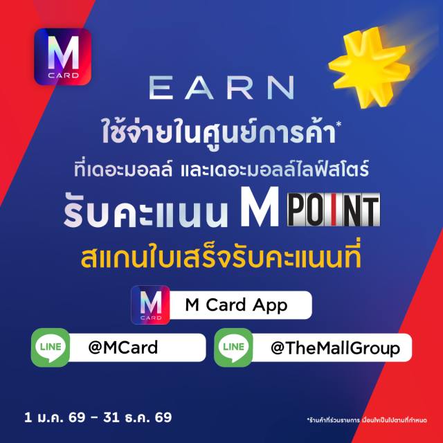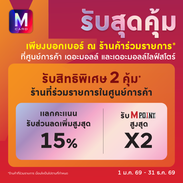 - เงื่อนไขเป็นไปตามที่ธนาคาร และ/หรือร้านค้ากำหนด ธนาคารอาจมีการเปลี่ยนแปลงเงื่อนไข สินค้า/บริการ หรือสิทธิประโยชน์ ซึ่งจะแจ้งให้ทราบล่วงหน้า สอบถามข้อมูลเพิ่มเติม ณ จุดขาย หรือ ศูนย์บริการสมาชิกบัตรเครดิต Bangkok Bank M Visa โทร. 0 2638 4100