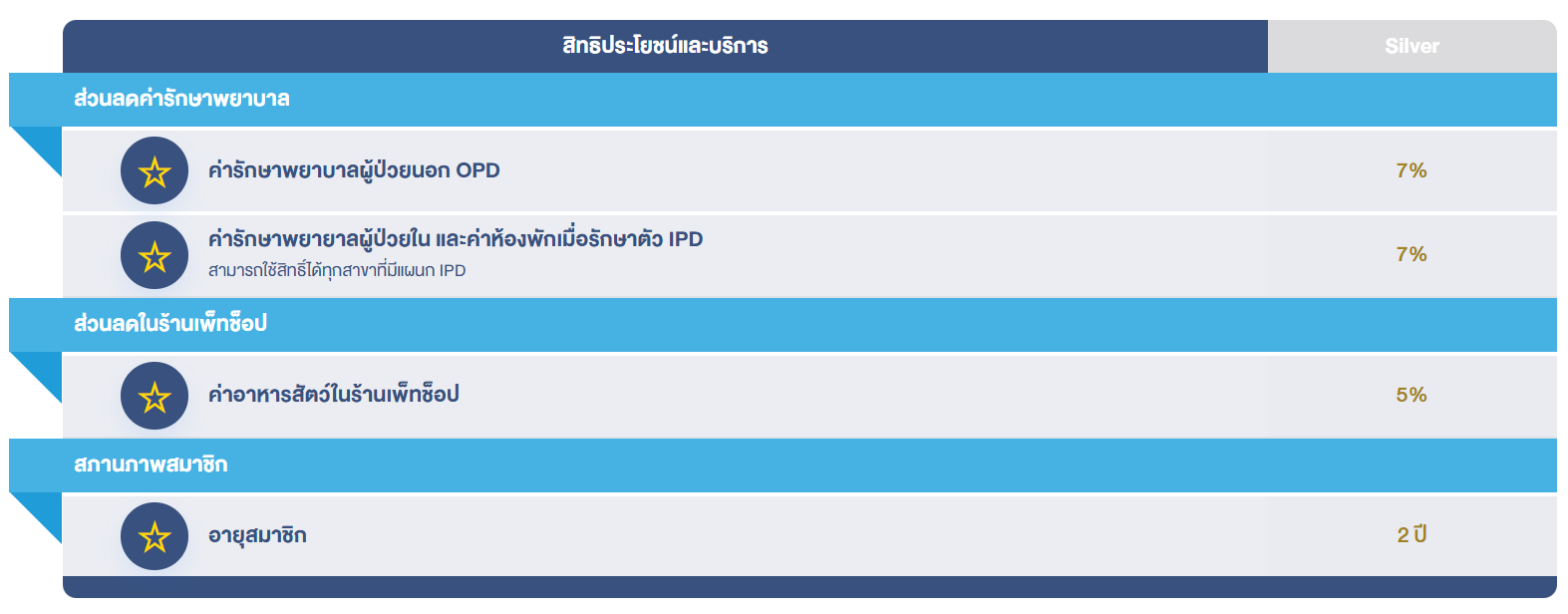 - รับส่วนลด 7% สำหรับค่ารักษาพยาบาลผู้ป่วยใน และค่าห้องพักเมื่อรักษาตัว IPD