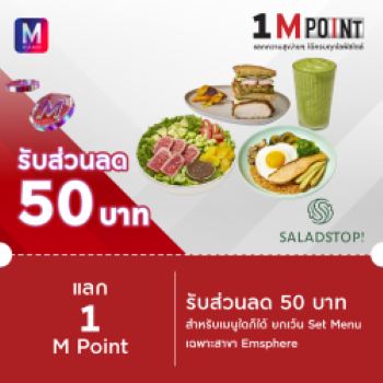 6. SaladStop! : แลก 1 M Point รับส่วนลด 50 บาท สำหรับเมนูใดก็ได้ ยกเว้น Set Menu ที่ Salad Stop เฉพาะสาขา Emsphere คลิก
