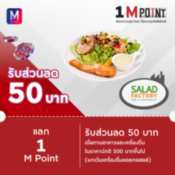 8. Salad Factory : แลก 1 M Point รับส่วนลด 50 บาท เมื่อทานอาหารและเครื่องดื่ม 500 บาทขึ้นไป (ยกเว้นเครื่องดื่มแอลกอฮอล์) ที่ Salad