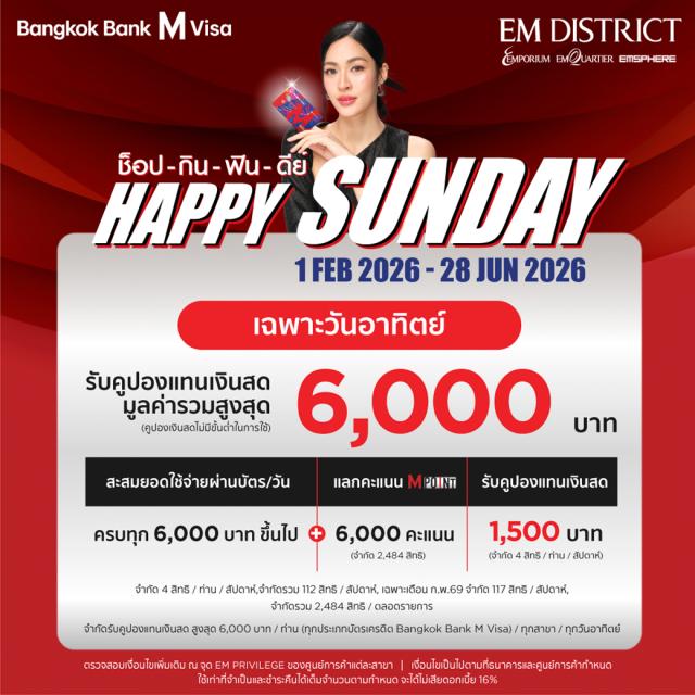 - สิทธิพิเศษสำหรับผู้ถือบัตรเครดิต Bangkok Bank M Visa ที่มียอดใช้จ่าย ณ ร้านค้าหรือร้านอาหารที่ร่วมรายการและชำระแบบเต็มจำนวน ตามเงื่อนไขที่กำหนด ภายในศูนย์การค้า เอ็มโพเรียม, เอ็มควอเทียร์ และ เอ็มสเฟียร์เท่านั้น (ไม่รวมรายการผ่อนชำระ และ BE SMART ทุกประเภท) ยกเว้น การใช้จ่ายภายในห้างสรรพสินค้า EMPORIUM / EMQUARTIER / EMSPHERE / FOOD COURT / GOURMET TAKE AWAY / GOURMET TAKE HOME / GOURMET MARKET / POWER MALL / SPORTS MALL / ร้านอาหาร / สินค้าผ่อนชำระ / บัตรโทรศัพท์ โทรศัพท์มือถือรายเดือน บัตรเติมเงิน / GIFT CARD / VOUCHER / ธุรกรรมทางการเงินกับทางธนาคาร / การชำระเบี้ยประกันทุกประเภท / ค่าสาธารณูปโภคต่างๆ / ค่าดอกเบี้ย / ค่าชำระภาษี / ค่าปรับ / ค่าธรรมเนียมต่างๆ / การออกใบเสร็จที่ไม่มีระบุเลขประจำตัวผู้เสียภาษีอาการและบิลเงินสด / ใบเสร็จจากการชำระสินค้าผ่านทางช่องทางออนไลน์ / ใบเสร็จที่เกิดจากการชำระสินค้าผ่านการสแกน QR CODE ที่ไม่ได้ผ่านเครื่อง EDC ของทางร้านค้า / ใบเสร็จที่เกิดจากการมัดจำสินค้า ไม่สามารถร่วมรายการได้ทุกกรณี ร้าน AVEDA, ATELIER DE PRESTIGE, CLE DE PEAU, CHAMPION & NIKE, CREED, DEAN & DELUCA, DIPTYQUE,FRESH, KIEHL'S, LA PATIS, IPSA, M.A.C., NARS, TAKE CARE, VICTORIA BY COCOTTE, WINE CELLAR และ YSL BEAUTY