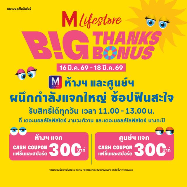 1. Cash Coupon 300 บาท สำหรับช้อปแฟชั่น & สปอร์ต ภายในศูนย์ตั้งแต่ 1,000 บาท/ใบเสร็จ เฉพาะร้านค้าที่ ร่วมรับคูปองแทนเงินสด ภายในศูนย์ฯ เดอะมอลล์ไลฟ์สโตร์ งามวงศ์วาน และบางกะปิ เท่านั้น